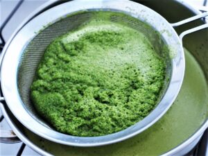 Esprema o bagaço. Na extração de clorofila o bagaço não tem utilidade, mas você pode aproveitar para outros fins culinários.