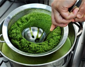 Corte o fogo e, com uma concha pegue delicadamente os grumos de clorofila e passe num coador. O processo todo tem que ser delicado pois senão os grumos de clorofila se desfazem e passam pelo coador.