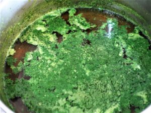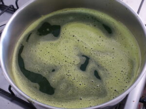 Leve a panela com o líquido verde ao fogo. Não precisa ferver, logo notará que a clorofila começará a aglutinar formando grumos.
