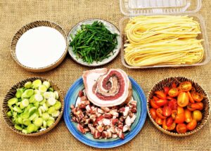 – Presunto cru cortado em fatias e feito em pedaços ou panceta curada ou bacon de boa qualidade cortados em cubinhos. Na versão aqui apresentada foi utilizada a panceta. Também é possível a utilização de uma boa linguiça para adquirir um ar mais, digamos, mineiro(!?). É possível dispensar a carne para versão vegetariana.