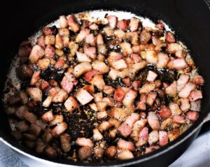 – Paralelamente leve a panceta (ou bacon) ao fogo até formar uma crostinha crocante.