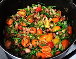 – Acrescente os tomates e tempere com sal e pimenta.
