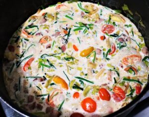 – Finalize o molho com creme de leite e cebolinha francesa.