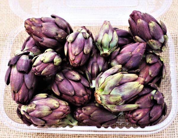 Os botões de alcachofras são colhidos ainda pequenos dos ramos secundários da planta para dar mais força para a flor principal. Por serem precoces são tenras e as pétalas interas e os pelinhos do topo do fundo são comestíveis, o que os torna bem aproveitáveis apesar do trabalho de desbaste das partes duras (você pode checar o processo na nossa sessão de receitas).