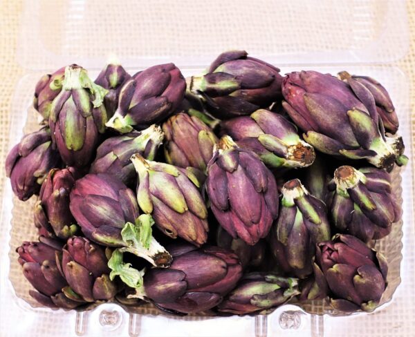 Os botões de alcachofras são colhidos ainda pequenos dos ramos secundários da planta para dar mais força para a flor principal. Por serem precoces são tenras e as pétalas interas e os pelinhos do topo do fundo são comestíveis, o que os torna bem aproveitáveis apesar do trabalho de desbaste das partes duras (você pode checar o processo na nossa sessão de receitas).