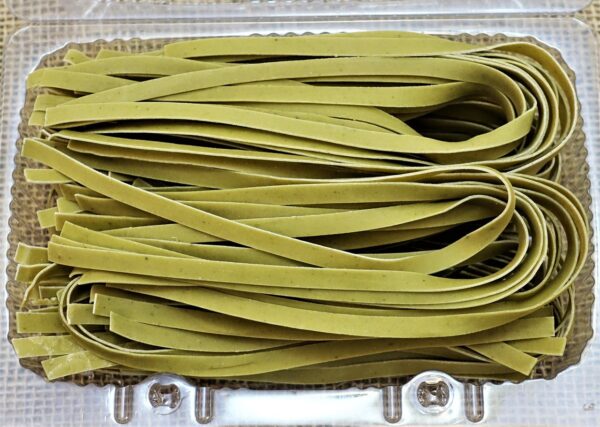 Fetuchini verde com manjericão, o gosto é bem suave, então caso queira abusar do manjericão recomendamos o molho pesto.