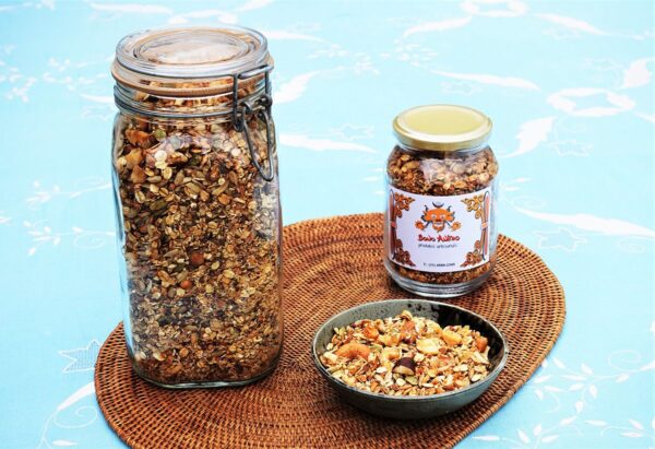 Uma receita clássica, sem nada de produtos expandidos e derivados de soja (evitando assim os transgênicos) e com a proporção de pelo menos 70% de sementes, castanhas e coco em relação ao cereal. O sabor é adocicado, mas sem exagero para valorizar cada um dos ingredientes, temos a versão que leva o mel e outra vegana, na qual utilizamos o melado.