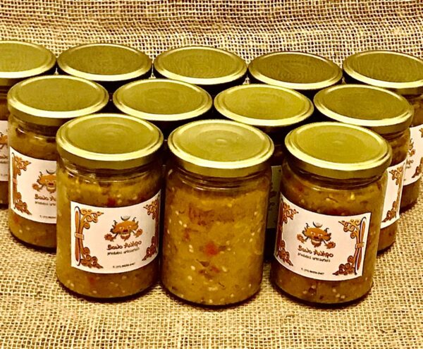 Para produzir esse antepasto assamos as beringelas e pimentões até murcharem. Das beringelas raspamos a polpa com colher e moemos na faca. Dos pimentões retiramos a pele e semente epicamos em pedacinhos.