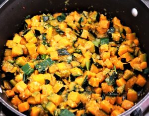 Numa outra panela refogue a outra metade da cebola e alho. Acrescente os cubinhos de abóbora kabotcha, um pouco de sal e refogue quase até o ponto. Reserve.