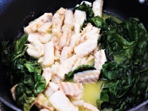 Paralelamente refogue as folhas de couve/kale no azeite. Assim que estiverem murchas coloque-as na borda da panela e acrescente o bacalhau e regue novamente com azeite. Note que a ideia não é terminar o cozimento, mas deixar no meio caminho e mandar para o forno já quente. Acrescente um pouco de pimenta do reino moída e cheque o sabor. Se for preciso acrescente sal.