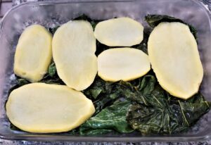 Pegue uma forma e forre a base com parte da couve/kale, colocando em seguida uma camada de rodelas de batata.