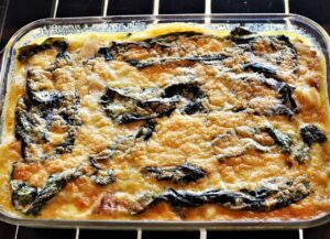 Despeje o ovo batido com creme de leite para que penetre bem nas camadas até cobrir as folhas de couve/kale.