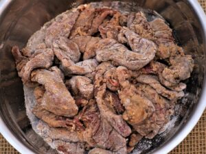 Pegue a carne marinada e passe na farinha – nós preferimos maizena ou mistura de maizena com farinha, mas pode ser só farinha.