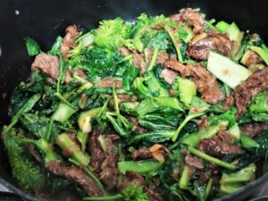 Este stir fly é uma composição de carne marinado no molho de shoyu picante com verduras orientais. Você pode utilizar também carne suina ou frango, e substituir as verduras por outras mais comuns, como acelga, moyashi (broto de feijão) e shingensai/bok choi.